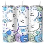 A Romantikus Hajnal Egyedi Tumbler a Valentin-nap lágy, pasztell színeit és romantikus hangulatát idézi meg. A fehér alapot pasztellkék, zöld, lila és halvány rózsaszín szívek, csillagok és Valentin-napi motívumok díszítik. A dizájn központi eleme három szív alakú képhely, amelyekbe kedvenc fotóidat helyezheted, így ez a tumbler nemcsak praktikus, hanem egyedi és személyes ajándék is.