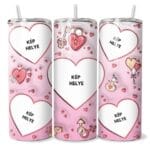 A Szívek Hangja Egyedi Tumbler a Valentin-nap romantikus és játékos szellemét hozza el. A rózsaszín alapot apró szívecskék, romantikus motívumok, mint például lakatok, kulcsok, szívek és szerelem-szimbólumok díszítik. A tumbler központi eleme három szív alakú képhely, amelyekbe saját fotóidat helyezheted, hogy személyes és különleges ajándékot adhass.
