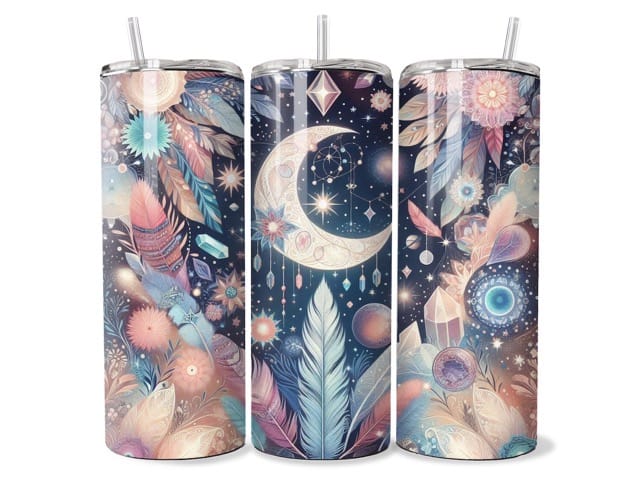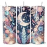 Merüljön el az álmodozás világában a Holdfény Álom Tumbler segítségével! Ez a tumbler lenyűgöző holdfényes dizájnnal készült, amelyet bohém stílusú tollak, kristályok és csillagok díszítenek. A mély éjszakai égbolt háttere, kombinálva az aranyló és pasztell színekkel, egy varázslatos és misztikus megjelenést biztosít. A tumbler kiváló minőségű anyagokból készült, így italai mindig frissen maradnak, legyen szó hideg vagy meleg italokról. Tökéletes ajándék minden bohém és misztikus stílus kedvelőjének, akik szeretnék, hogy mindennapjaikban egy kis varázslat is jelen legyen