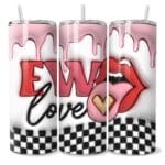 Az “Irónikus Ajkak Tumbler” egyedi, vagány és humoros kialakításával vonzza a figyelmet. A tumbler fehér alapszíne tökéletesen harmonizál a rózsaszín csepegtetett fedél dizájnnal, amely megidézi a trendi és játékos stílust. A fekete-fehér kockás minta modern kontrasztot biztosít, míg a nagy, piros “Ew Love” felirat és az ajkak szimbólumával fűszerezett szív képe egy kis ironikus csavart visz a megjelenésbe.