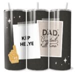 Az Apa Törődés Egyedi Tumbler az édesapák iránt érzett szeretet és tisztelet modern kifejezője. A sötétzöld, enyhén márványos háttér csillogó csillagokkal és egyedi apák napi grafikákkal díszített. A „Dad, you’re the greatest of all time” felirat érzelmi töltettel teszi különlegessé ezt az ajándékot, míg a képkeretek lehetőséget nyújtanak személyes pillanatok megosztására.