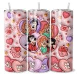 Az Ölelés Melege Tumbler egy bájos, Valentin-napi hangulatú pohár, amely tele van szeretettel, romantikával és nosztalgikus karakterekkel. A dizájn középpontjában rajzfilm figurák állnak, akik egy szívmelengető jelenettel idézik meg a szeretet és a barátság pillanatait. A háttérben színes szívecskék, csillagok, szerelmes üzenetek („Be Mine”, „Hug Me”, „Love”) és Valentin-napi szimbólumok, mint a szárnyas borítékok és édességek jelennek meg. Ez a tumbler tökéletes választás romantikus ajándéknak vagy saját magad kényeztetésére.